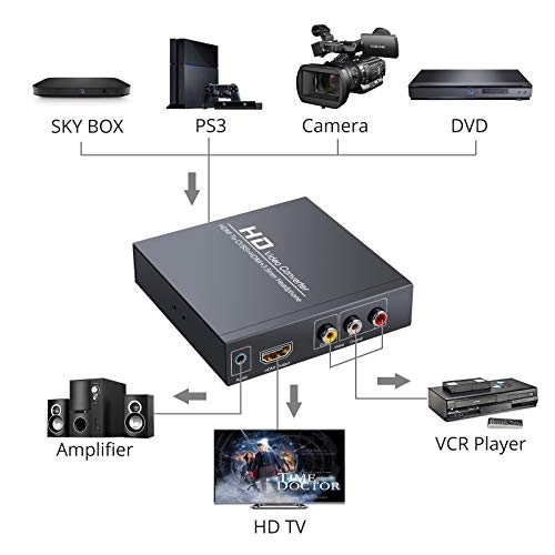 【Un Ingresso a Due Uscite】 Il Convertitore Video HD che Può Essere Assegnato un Segnale HDMI al Segnale HDMI + Segnale AV(CVBS) Composito Video + Audio Stereo FR/FL. Convertire Segnale HDMI di Alta Qualità in Normali Segnali CVBS (Risoluzione Standard 480i, 576i) che Possono Essere Riprodotti su Televisori CRT, Registratori VHS, Registratori DVD, ecc.