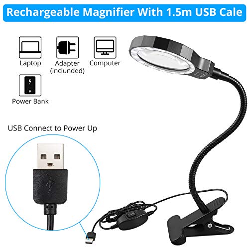 ESYNiC 5X Lente d'Ingrandimento LED con Alimentatore e Supporto da Tavolo 2 in 1 Lente di Ingrandimento 90mm con Lampada 16 LED SMD 140-170LM Luce Regolabile USB Magnificatore Pieghevole 360° a Clip