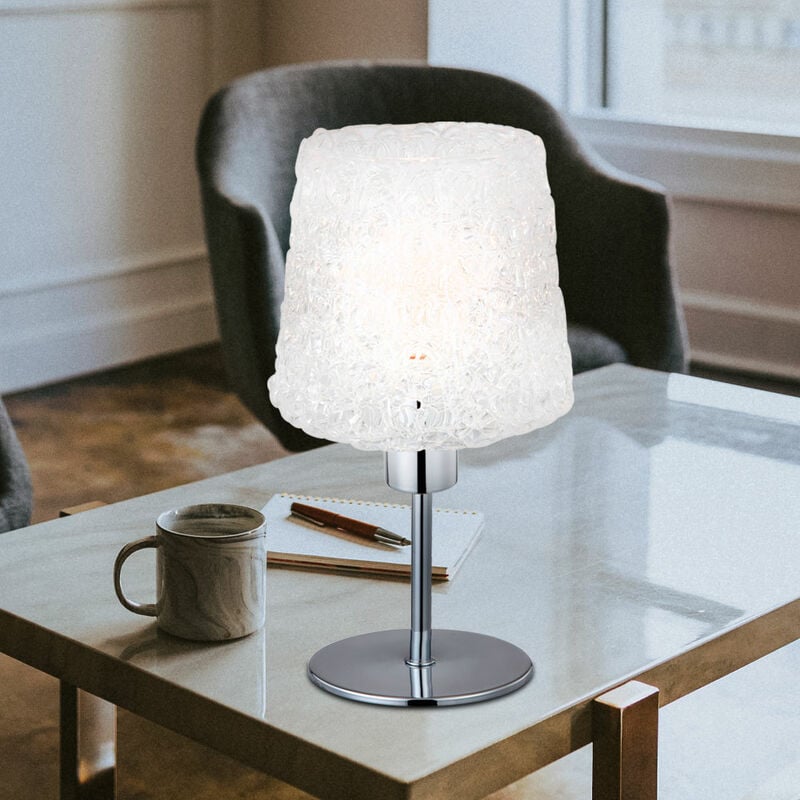 Descrizione Che sia in ingresso su un tavolino, in soggiorno su una mensola o sul comodino in camera da letto, questa lampada da tavolo può essere posizionata ovunque ed è una bella vista. Con la cornice cromata, si abbina bene a molti interni colori. Il paralume trasparente in rete acrilica conferisce a questo modello un tocco tutto particolare. La presa E14 incorporata consente anche di scegliere la lampada (max. 40W). La lampada non è inclusa nella fornitura. Dettagli lampada • tipo di lampada: lampada da tavolo• materiale: cromato • paralume: treccia acrilica, trasparente• interruttore • diametro x altezza in cm: 12,5 x 25 • Presa: 1x E14 • lampadine incluse: no • lampadine di alimentazione: max 1x 40 watt • alimentazione: 220-240V, 50-60Hz