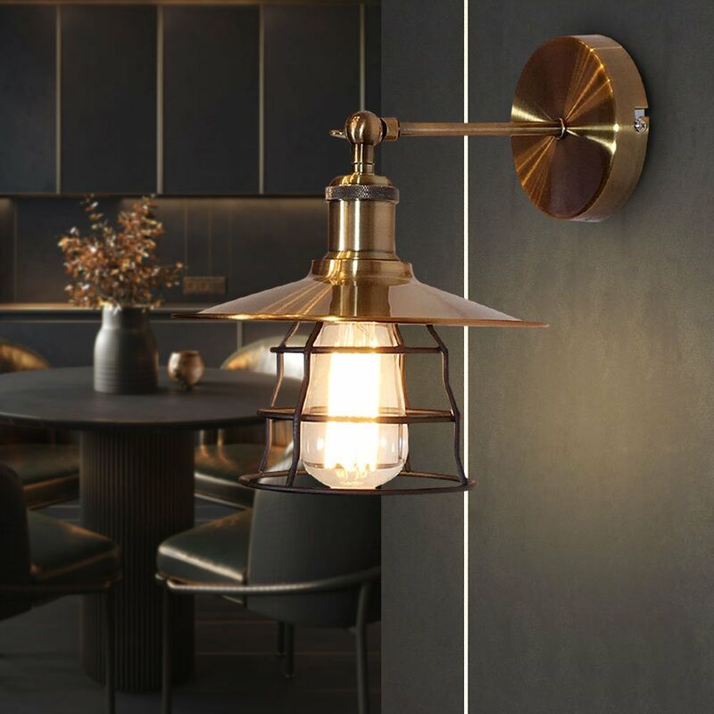 Dettagli lampada • tipo di lampada: lampada da parete • materiale: ottone antico • paralume: nero • forma: rotondo con griglia, 1 braccio • Dimensioni altezza x larghezza x sporgenza in cm: 28x22x28 • Attacco: 1x E27 • sorgente luminosa inclusa: no • adatto sorgente luminosa: 1x max 60W • Alimentazione: 230V
