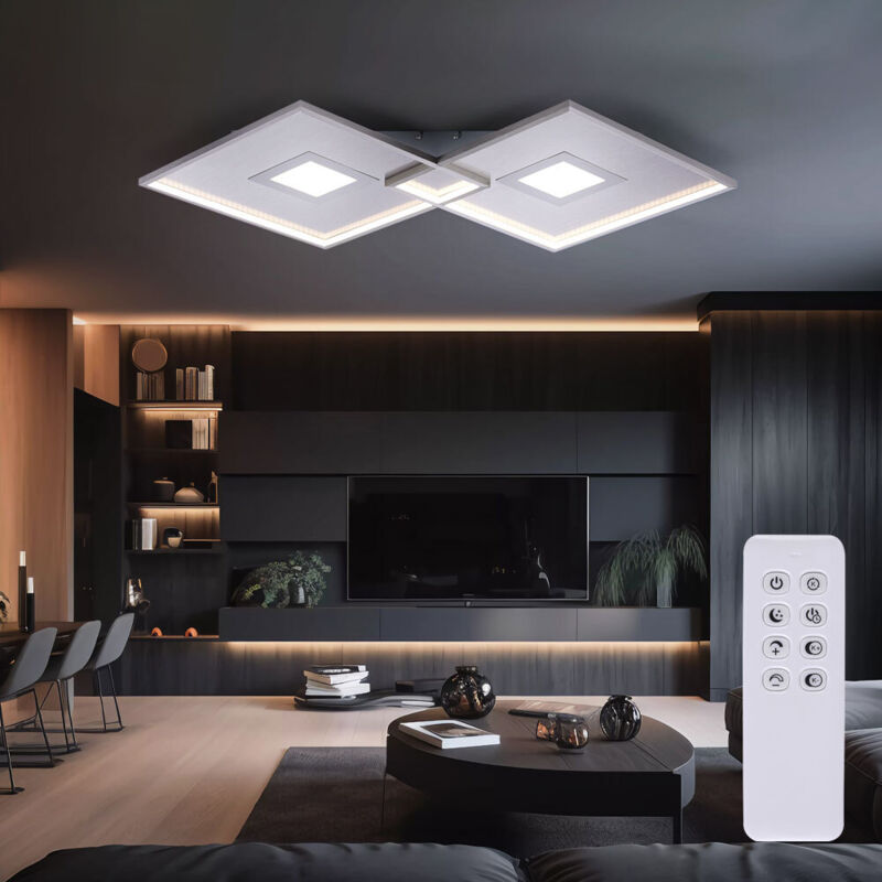 Descrizione La plafoniera a LED color acciaio colpisce per il suo design moderno e piatto e la sua forma geometrica. Viene fornito con un telecomando a infrarossi e una sorgente luminosa a LED installata in modo permanente. Utilizzando la gestione della luce CCT, si ha la possibilità di impostare la temperatura del colore della luce da bianco caldo a bianco luce diurna, simulando così i colori della luce di una routine quotidiana. È inoltre possibile attenuare l'intensità della luce dell'illuminazione a soffitto e salvare le impostazioni effettuate utilizzando la funzione di memoria. Queste regolazioni vengono effettuate utilizzando il telecomando in dotazione. L'illuminante è già installato nella lampada! Particolare lampada • Tipo di lampada: plafoniera • Materiale: metallo • Argento • Telecomando • Memoria funzione • Circuito CCT (2700-5000K) • dimmerabile • Grado di protezione: IP20 • Lunghezza x larghezza x altezza in cm: 96 x 56,6 x 6 • Peso: 4,3 kg • Sorgente luminosa: LED