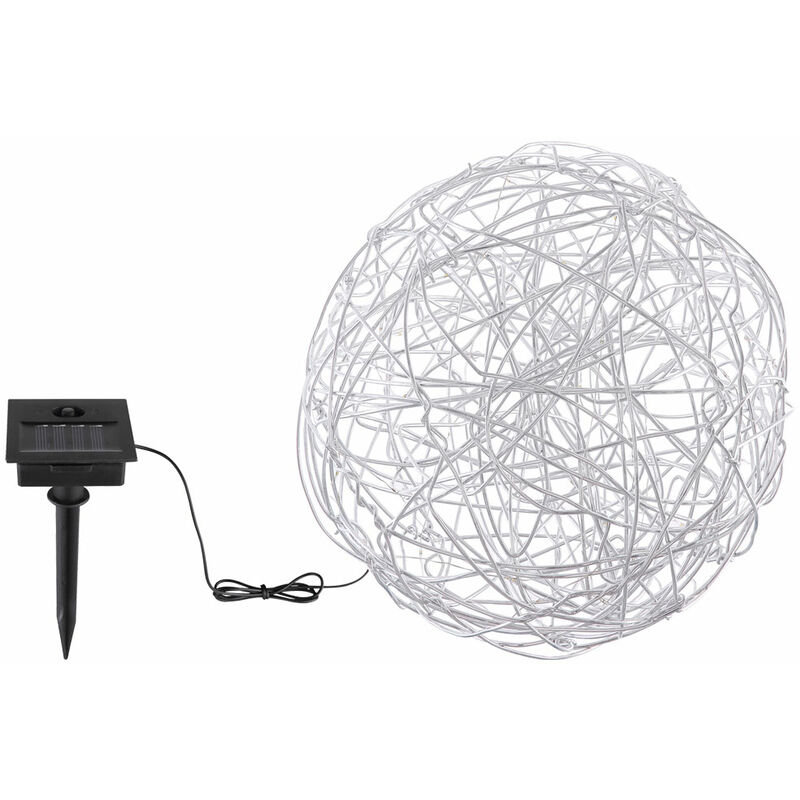 Descrizione Questa lampada solare argentata arricchisce il tuo giardino con il suo design moderno. Questa luce solare è collegata tramite un picchetto di terra. Il clou è la palla attaccata con una catena di luci. La luce bianca calda 3000K illumina l'area esterna fino a 8 ore. Grazie al grado di protezione IP44, questa luce solare è ideale per le aree esterne. Dettagli lampada • tipo di lampada: lampada solare • materiale: plastica, alluminio • colore: argento • batteria inclusa: Sì• lucine • classe di protezione: IP44 • tempo di illuminazione: circa 8 ore • diametro x altezza in cm: 30 x 30 • Lampadine: LED • lampadine incluse: si • lampadine: 3 volt• temperatura colore: 3000 Kelvin• colore della luce: bianco caldo