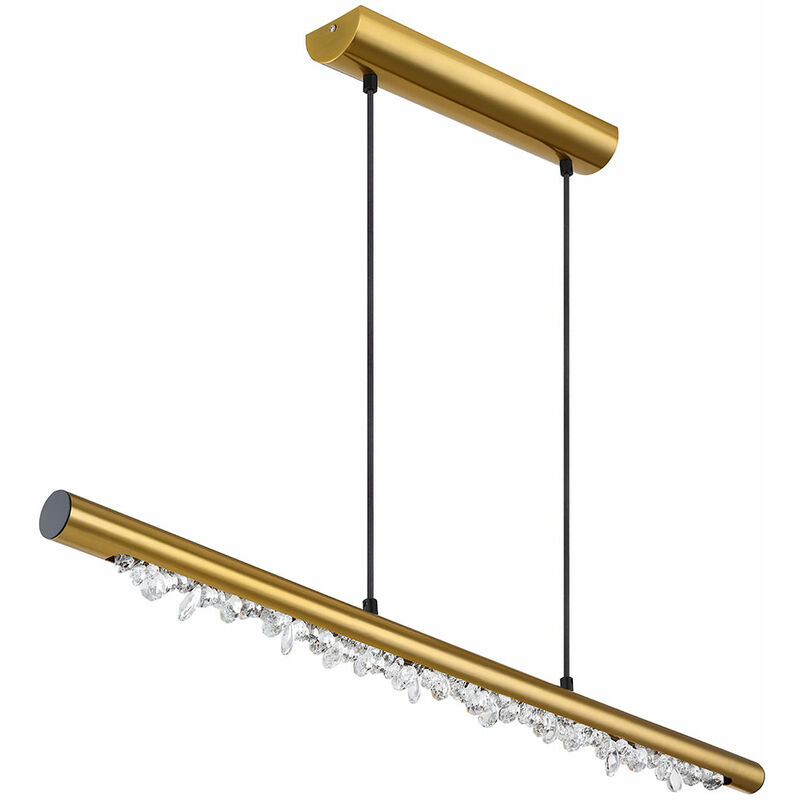 Descrizione Questa lampada a sospensione (100x8 cm) colpisce per il suo design semplice realizzato in metallo color ottone. Consiste in un'asta di metallo, che ha bellissimi cristalli acrilici sul lato inferiore e pende fino a 150 cm dal soffitto su due cavi. La dotazione quelle lampadine a LED forniscono 980 lumen di luce con un piacevole colore della luce di 3000 Kelvin (bianco caldo). Puoi vedere l'immagine complessiva con altri elementi della stessa serie Completa i tuoi interni. Una lampadina LED è installata in modo permanente nella lampada. Dettagli lampada • Tipo di lampada: lampada a sospensione • Materiale: metallo• Cristalli acrilici • Colore: ottone, chiaro• Classe di protezione: IP20 • Lunghezza x larghezza x altezza in cm: 100x8x150 • Illuminante: 1x LED • Lampadine incluse: Sì • Potenza lampadina: 1x 15 watt • Flusso luminoso: 1x 980 lumen • Colore luce: bianco caldo • Alimentazione: 220-240V, 50-60Hz Dettagli sorgente luminosa • Tipo di lampada: LED • Flusso luminoso