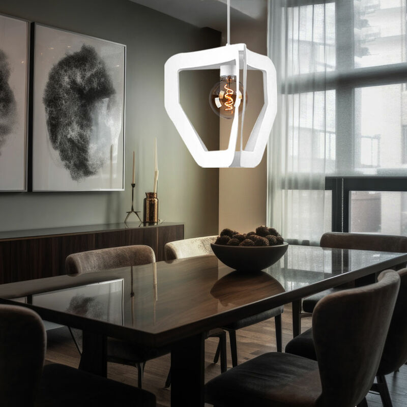 Descrizione Questa lampada a sospensione rappresenta lo stile di vita moderno e crea un'atmosfera suggestiva nel tuo spazio abitativo. Ha un'altezza di 120 cm e convince sopra il tavolo della cucina o come elemento di stile in sala da pranzo o in soggiorno, ad esempio sopra il tavolino da caffè. La sorgente luminosa non è inclusa nella fornitura. Particolari • Tipo di apparecchio: lampada a sospensione • Materiale: acciaio • Colore bianco • Grado di protezione: IP20 • Cornice triangolare • Lunghezza x larghezza x altezza in cm: 35 x 32 x 120 cm • Presa: 1x E27 • Lampadine incluse: no • Lampadine: 1x max 60 watt • Voltaggio: 220-240V, 50-60Hz