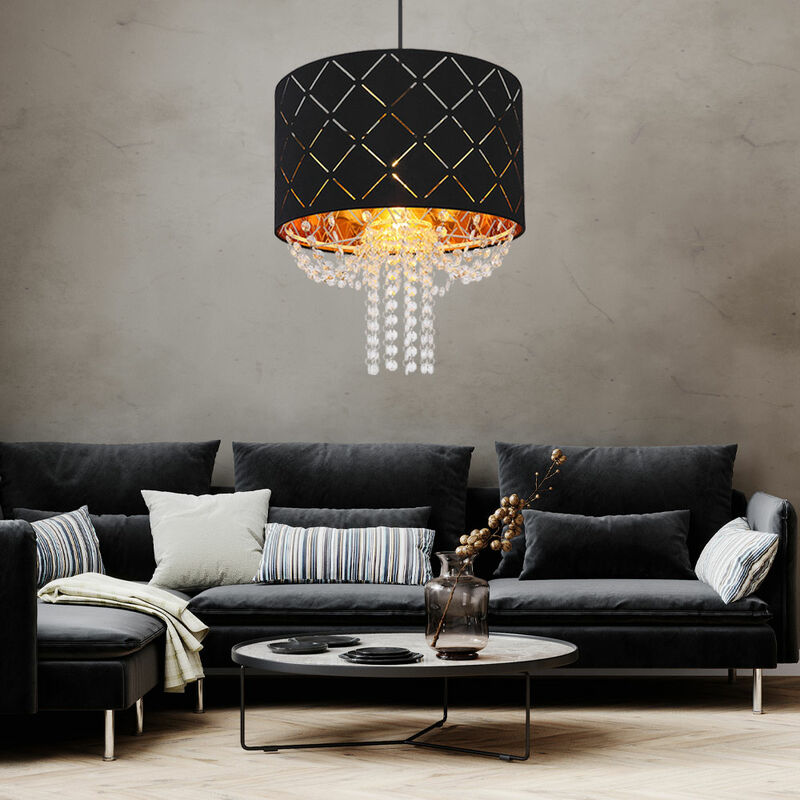 Descrizione Uno speciale colpo d'occhio per la tua casa: con il suo design moderno, la lampada colpisce e ti consente di mettere abilmente un accento meraviglioso in quasi tutte le stanze che desideri. Durante la realizzazione di questa lampada a sospensione, sono stati scelti i colori nichel opaco e nero, il paralume è stato decorato con punzonature decorative, che conferiscono a questa lampada un aspetto unico, che la rende sicuramente un'attrazione. La presa E27 integrata consente di scegliere autonomamente una lampada adatta (max 40W). Consigliamo le lampade a LED per il loro risparmio energetico e la loro longevità. La sorgente luminosa non è inclusa nella fornitura. Dettagli lampada • Tipo di lampada: lampada a sospensione • Materiale: metallo, velluto • Colore: nero, color oro • Decorazioni in cristallo • Punzonature decorative • Diametro x altezza in cm: 35 x 150 • Numero di versioni: 1 • Base: E27 • Potenza massima: 40W (watt) • Voltaggio: 230V (volt) • Lampadine incluse