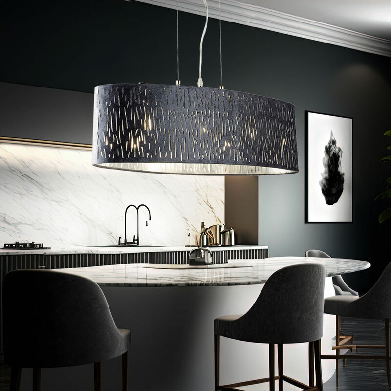 Descrizione L'espressiva lampada a sospensione ovale della serie Tarok colpisce per il suo design elegante e moderno. Il paralume ovale in metallo è ricoperto di velluto grigio e presenta punzonature decorative. Il rivestimento in velluto lo rende un vero colpo d'occhio. Il paralume è lungo 65 cm e largo 25 cm e ha una finitura in nichel opaco all'interno. Grazie alla sua lunghezza, la lampada può essere utilizzata sopra un grande tavolo da pranzo o nella zona giorno come elegante fonte di luce che fornisce sempre un'illuminazione d'atmosfera. Dettagli luce • Tipo di lampada: Sospensione • Materiale: Metallo • Colore: nichel opaco• paralume: velluto, grigio, argento metallizzato• perforazioni decorative• classe di protezione: IP20 • Lunghezza x larghezza x altezza in cm: 65 x 25 x 140 • Prese: 3x E27• Lampadine incluse: Sì• Potenza lampadina: 3x 6 watt• Flusso luminoso: 3x 720 lumen• Colore luce: bianco caldo • Alimentazione: 220 -240V, 50-60Hz Dettagli lampadina • Tipo di sorgente