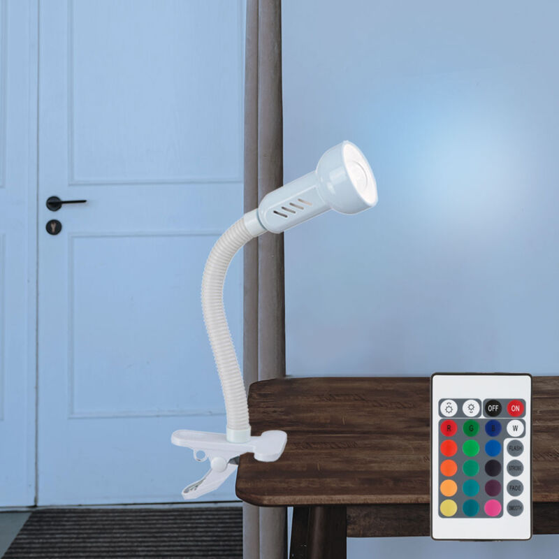 Descrizione Il classico faretto a morsetto serve principalmente allo scopo di una classica lampada da scrivania. Il paralume in plastica bianca, fissato ad un braccio flessibile, ha un attacco E14 che permette di scegliere liberamente la sorgente luminosa (max. 40W). Utilizzando il telecomando in dotazione, la lampada LED RGB può essere impostata in diversi colori e quindi fornisce un'illuminazione d'atmosfera.Rispetto alle normali lampade, i faretti LED consumano una quantità minima di elettricità e sono in la gamma Consumo anche con lampade a risparmio energetico Questo protegge l'ambiente e il tuo portafoglio Una lampada LED RGB di alta qualità a risparmio energetico e un telecomando per la luce bianca e il controllo RGB sono inclusi nella gamma dotazione. Dettagli lampada • tipo di lampada: lampada a pinza • materiale: metallo • paralume: plastica • colore: bianco • braccio flexo • classe di protezione: IP20 • Altezza in cm: max 48 • attacco: 1x E14 • lampadine incluse: si