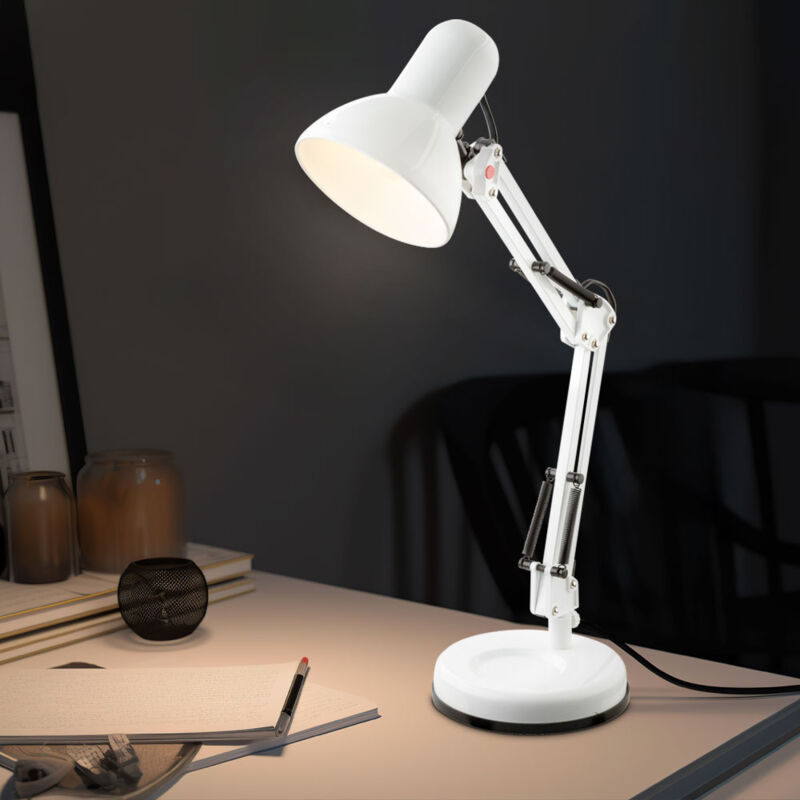 Descrizione Questa lampada da tavolo bianca è l'aggiunta ideale a qualsiasi scrivania. È molto economico perché possono essere utilizzate lampade a LED. Tre snodi consentono di allineare in modo ottimale il fascio di luce per consentire un lavoro rilassato. Consigliamo l'uso di lampadine a LED per motivi di risparmio energetico e longevità. La lampada non è inclusa nella fornitura. Dettagli lampada • tipo di lampada: lampada da tavolo• materiale: metallo, plastica• Colore: bianco• interruttore• braccio mobile• punto mobile• Lunghezza x larghezza x altezza in cm: 40x15x60 • presa: 1x E27• Lampadine incluse: no• lampadine di potenza: 1x max 40W (watt)• tensione di esercizio: 220- 240V, 50-60Hz