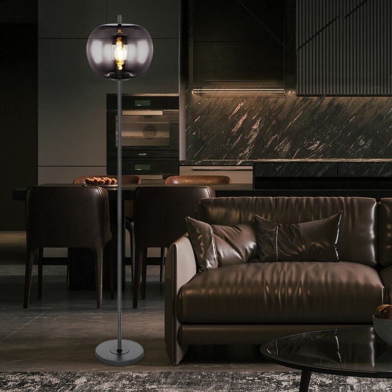 Descrizione La lampada da terra BLACKY è realizzata in metallo nero con vetro fumè (Ø 30 cm). Il bicchiere è individuale nella sua presentazione. Questa lampada alta 160 cm con interruttore ha un attacco E27 (max. 60 watt), che consente una libera scelta della sorgente luminosa. dettagli apparecchio • Tipo di lampada: piantana • Materiale: metallo • Colore: nero • Paralume: vetro, fumè • interruttore • Diametro x altezza in cm: 160x30 • Portalampada: 1x E27 • Lampadina inclusa: Sì• Potenza della sorgente luminosa: 1x 6 watt• Flusso luminoso: 1x 720 lumen• Colore luce: bianco caldo • Alimentazione: 220-240V, 50-60Hz Dettagli sorgente luminosa • Tipologia sorgente luminosa: LED • Attacco: E27 • Forma: Sfera • Materiale: Vetro • Colore: Trasparente • Flusso luminoso: 720 lm (Lumen) • Consumo energetico: 6 kWh/1000h • Temperatura colore: 2700 K (Kelvin) • Colore della luce: bianco caldo • Resa cromatica (Ra): 80 • Consumo energetico nominale: 6 W (Watt) • Durata utile nominale: 10.000 h