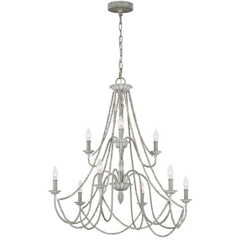 Descrizione Il lampadario Maryville da 9 litri presenta morbidi tratti femminili in stile country francese. I bobeches di ispirazione floreale e i delicati fili di perline di legno sono tutti rifiniti in un grigio lavaggio invecchiato. Dettagli • Ubicazione: Interno • Lunghezza estesa minima: 934mm $Lunghezza massima estensione: 3110mm • Colore superficie: Grigio lavato • Materiale: Acciaio, legno • Numero fiamme: 9 • Potenza: 60W (Watt) • Tipo di presa: E14 • Dimensioni AxLxL: 83,8 cm x 81,3 cm x 81,3 cm