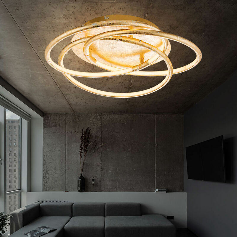 Descrizione Elegante plafoniera realizzata con materiali particolarmente pregiati. Questa lampada si adatta perfettamente a qualsiasi spazio abitativo e gli conferisce un tocco speciale. I tre anelli in alluminio color oro lo rendono un vero e proprio eye-catcher per ogni spazio abitativo. Una sorgente luminosa a LED è installata in modo permanente nella lampada! Lampada dettagli • Tipo di lampada: plafoniera • Materiale: alluminio, plastica satinata • Colore oro • Diametro x altezza in cm: 50 x 14 • Sorgente luminosa: 1x LED • Lampadine incluse: sì • Potenza lampada: 1x 30 watt • Flusso luminoso: 2100 lumen • Colore della luce: bianco caldo • Alimentazione: 220-240V, 50-60Hz Dettagli lampadine • Tipo di lampadina: LED • Flusso luminoso: 2100 lm (lumen) • Consumo energetico: 30kWh/1000h • Temperatura colore: 3000K (Kelvin) • Colore della luce: bianco caldo • Consumo energetico nominale: 30 W (watt) • Durata utile nominale: circa 30.000 h (ore) • Cicli di commutazione: circa 20.000x