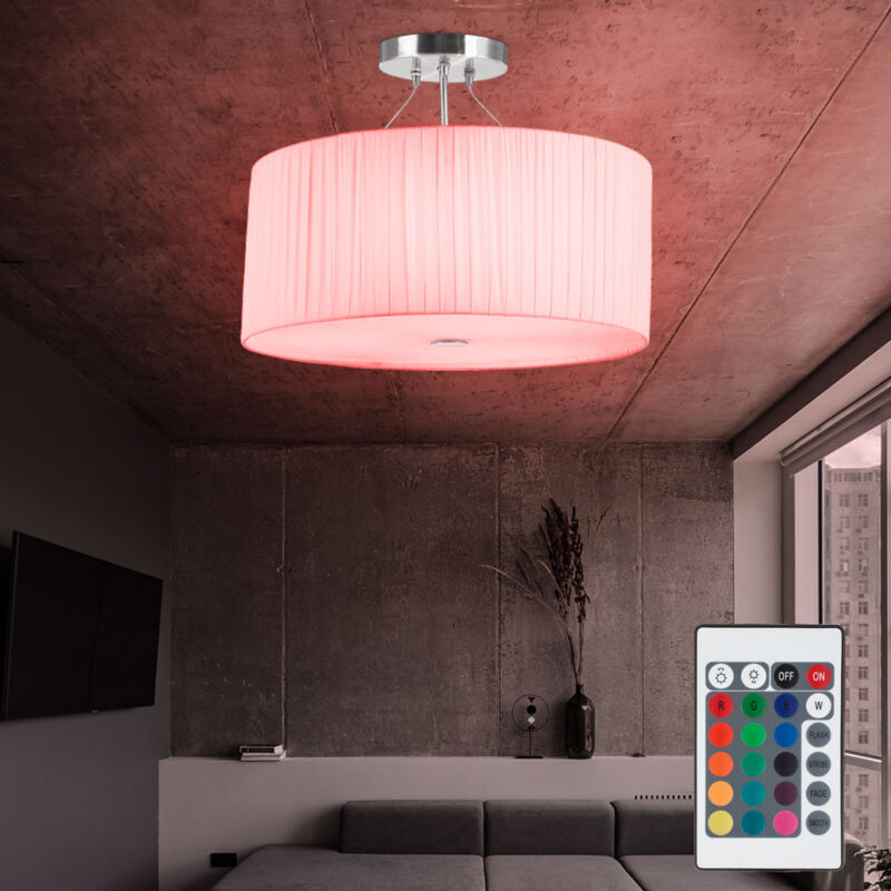 Descrizione Questa plafoniera promette luce radiante. Valuta il tuo soggiorno con questa elegante plafoniera e dagli un tocco nuovo. Questa lampada trova il suo posto sopra il tavolo della sala da pranzo o del soggiorno. Utilizzando il telecomando in dotazione, la sorgente luminosa RGB può essere impostata in diversi colori e garantisce così un'illuminazione d'atmosfera I faretti a LED consumano solo una minima quantità di elettricità e sono anche utilizzati sotto luci a risparmio energetico. Questo non solo protegge il tuo portafoglio, ma anche l'ambiente. Sono incluse tre lampade LED RGB 7 watt di alta qualità a risparmio energetico e un telecomando per la luce bianca e il controllo RGB. Dettagli lampada • tipo lampada: plafoniera • montatura: nichel opaco • Paralume: Tenda plissettata, bianco • Dimensioni diametro x altezza in cm: 45x36 • Attacchi: 3x E27 • Lampadine incluse: Sì • Lampadine: 21 watt (3x 7 watt ) • flusso luminoso: 1410 lumen (3x 470 lumen) • telecomando: solo per
