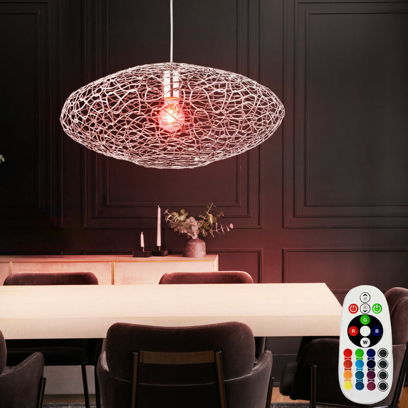 Descrizione Questa lampada a sospensione colpisce per il suo stile unico. La rete rotonda in alluminio (Ø40cm) attaccata alla sospensione cromata abbinata assicura un aspetto speciale. La rete metallica di questa lampada a sospensione fornisce una luce meravigliosamente rifrangente e quindi una grande atmosfera. Questo può essere fatto utilizzando il telecomando in dotazione Imposta le lampade LED RGB in diversi colori e garantisce così un'illuminazione d'atmosfera. È inclusa una lampadina LED RGB con telecomando per luce bianca e controllo RGB. Dettagli luce • Tipo di luce: lampada a sospensione• Materiale: cromo• paralume: rete di alluminio• diametro x altezza in cm: 40 x 120 • Attacco: 1x E27• Lampada inclusa: Sì• Potenza lampada: 1x 9 Watt• Luminosa flusso: 1x 806 Lumen• colore luce: bianco caldo• telecomando: Solo per la lampada• Tensione: 230V, 50Hz Dettagli Illuminante • Tipo di illuminante: RGB-LED • Attacco: E27 • Materiale: metallo argento, plastica • Colore luce: modalità