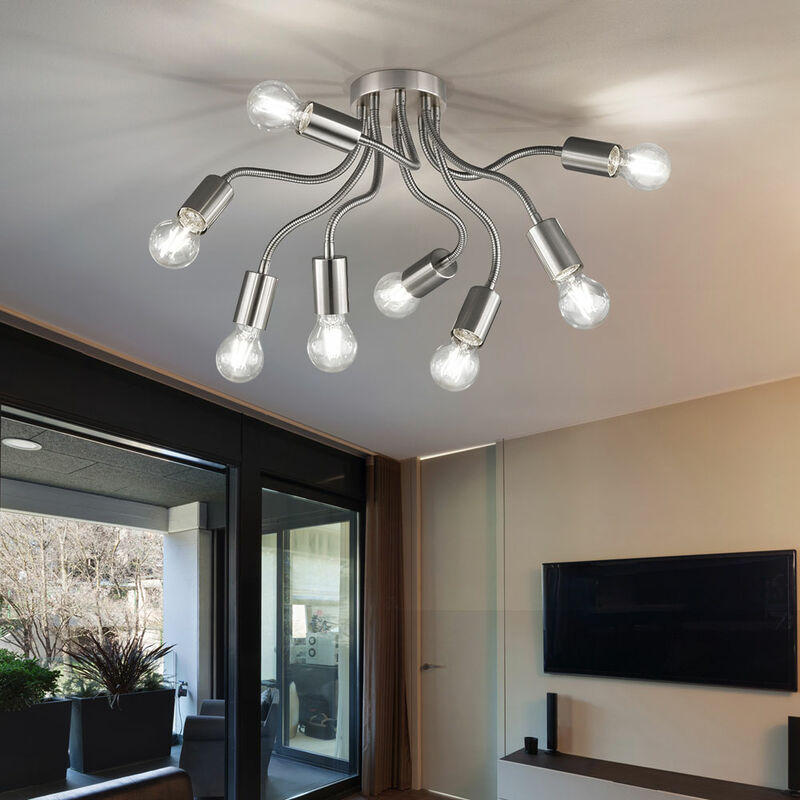Descrizione Questa straordinaria plafoniera attira davvero l'attenzione. Grazie agli otto bracci mobili, nessun punto viene lasciato spento. Ogni singolo braccio può essere orientato a piacimento. Si adatta meglio agli stili di vita e di arredamento più moderni, sia in soggiorno, camera da letto, camera degli ospiti, studio o sala da pranzo. Il metallo nichel-opaco conferisce alla lampada un aspetto decente. Grazie alle prese E27 esistenti, sei libero di scegliere l'illuminante e quindi la scelta del colore e dell'intensità della luce. Le lampadine non sono incluse nella fornitura. Particolare lampada • Tipo di lampada: plafoniera • Materiale: metallo • Colore: nichel opaco • Grado di protezione: IP20 • Bracci Flexo • Diametro x altezza in cm: 60 x 30 • Prese: 8x E27 • Lampadina inclusa: n • Potenza della lampada: 8x massimo 40 watt • Voltaggio: 230V, 50Hz