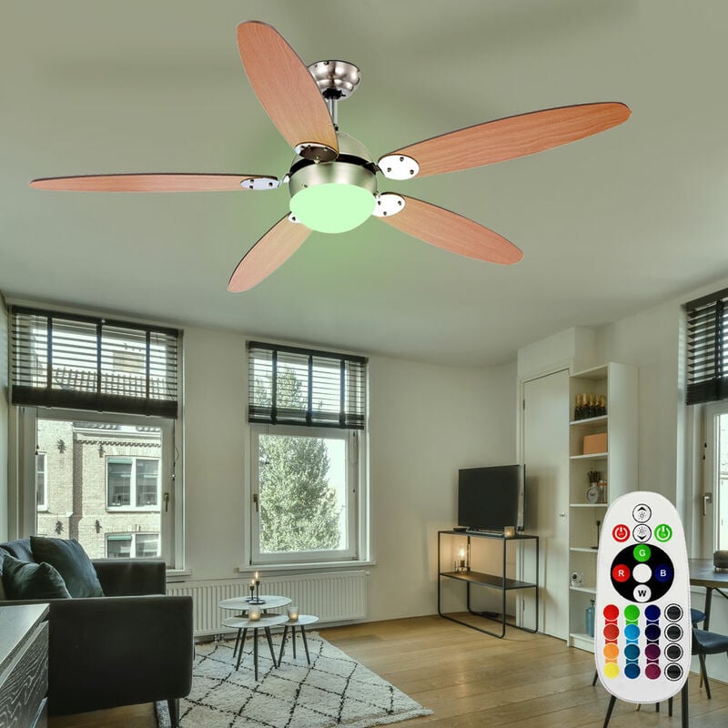 Descrizione Moderno ventilatore da soffitto con illuminazione e pale cambiabili in grafite o faggio. Questo moderno ventilatore da soffitto è un vero colpo d'occhio. Le pale della ventola di colore variabile e l'elemento di illuminazione integrato creano accenti speciali nei tuoi interni. Un motore potente e silenzioso assicura una perfetta circolazione dell'aria, che è ideale per stanze di 25-30 m². Quando fa di nuovo caldo, sia al lavoro che a casa, questo ventilatore da soffitto porta il tanto agognato raffreddamento, perché uno verso il basso Il flusso d'aria diretto crea un effetto di raffreddamento. La ventola può essere attivata utilizzando l'interruttore a strappo. È possibile impostare tre livelli di velocità, da 85 giri fino a 185 giri al minuto. Poiché l'aria calda sale fino al soffitto del soggiorno, puoi anche usa questo ventilatore Risparmia fino al 30% sui costi di riscaldamento perché ha un flusso di ritorno regolabile in modo che l'aria calda venga nuovamente premuta.