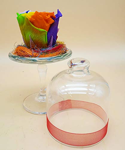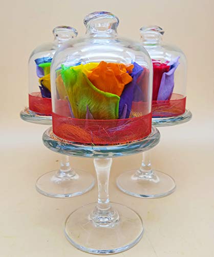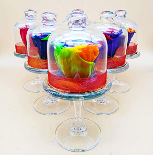 Rosa eterna Arcobaleno. Rosa preservata Mini Porta Torta in Vetro su Base di Foglie di Rosa eterne e sisal. Origine: Spagna.