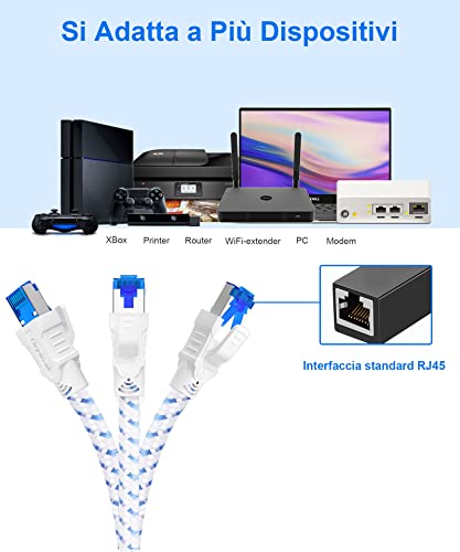 Cavi ad Ampia Compatibilità: I cavi di rete cat8 sono ampiamente compatibili con i cavi ethernet Cat5e, Cat6 e Cat7. I connettori del cavo RJ45 forniscono una connettività universale per PS5, PS4, Xbox, Switch, router, computer, stampanti di rete, NAS, accoppiatori, hub e altre apparecchiature di rete. Inoltre, il cavo internet può supportare le funzioni POE.