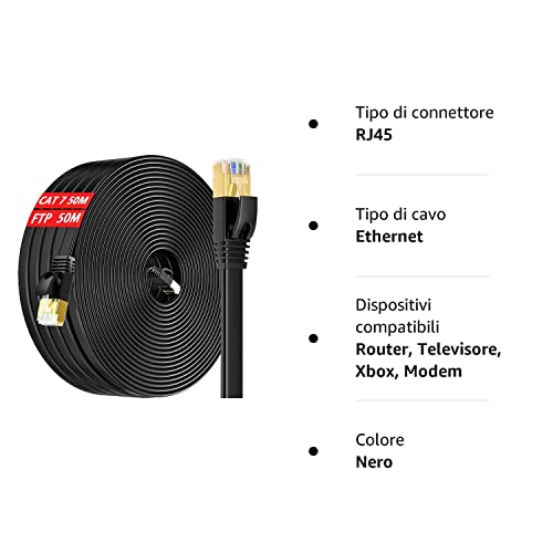 Cavo Ethernet Cat 7 50 Metri Cavo LAN 50mt Molto Lungo Piatto Filo Ethernet RJ45 Gigabit FTP Schermato Cavo Internet Anti-jamming Cavo di Rete Nero per Router Modem