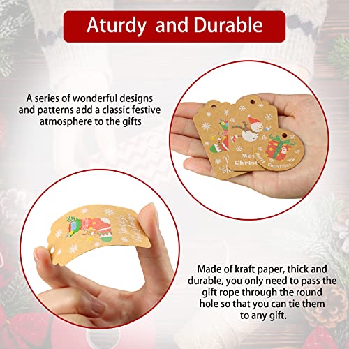 Materiali di Alta Qualità: Tag regalo di natale sono realizzati in carta kraft, con una superficie liscia e motivi chiari e carini, la corda è realizzata in cotone o canapa, che è resistente e può essere utilizzata a lungo.