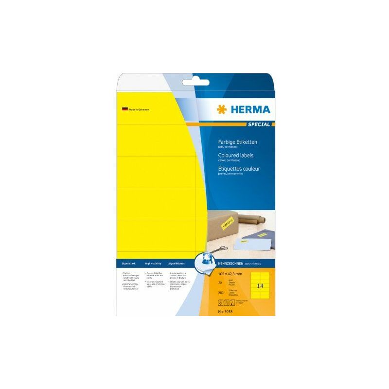 HERMA 5058. Colore del prodotto: Giallo, Tipo etichetta: Etichetta per stampante autoadesiva, Formato: A4. Larghezza dell'etichetta: 10,5 cm, Altezza dell'etichetta: 4,23 cm. Larghezza imballo: 212 mm, Profondità imballo: 8 mm, Altezza imballo: 325 mm. Etichette da pacchi: 280 pezzo(i), Fogli per pacco: 20 fogli, Etichette per foglio: 14 pezzo(i). Paese di origine: Germania