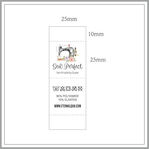 Nota: le etichette non sono tagliate. Per utilizzare queste etichette, è sufficiente tagliarle all'altezza della linea di taglio. Piegare la targhetta a metà e cucirla nella cucitura dell'indumento.