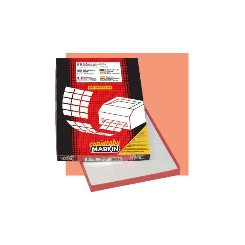 ETICHETTE AUTOADESIVE: - Le etichette AUTOADESIVE per stampanti inkjet, stampanti laser e fotocopiatrici. - www.markin.it per scaricare gratuitamente il software e stampare le etichette. - A disposizione di tutti gli utilizzatori in sei lingue. - Mantenere la carta adesiva conservata in luoghi asciutti e lontana da fonti di calore. Larghezza 190 mm Altezza 61 mm Etichette da pacchi 400 pezzo(i) Colore del prodotto Bianco Formato A4