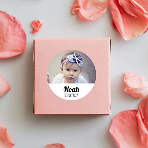Etichette adesive con foto per battesimo. Adesivi personalizzati con nome e data per i regali dei tuoi ospiti. Misura 45 mm / 60 mm / 70 mm di diametro. non adatto per l'abbigliamento