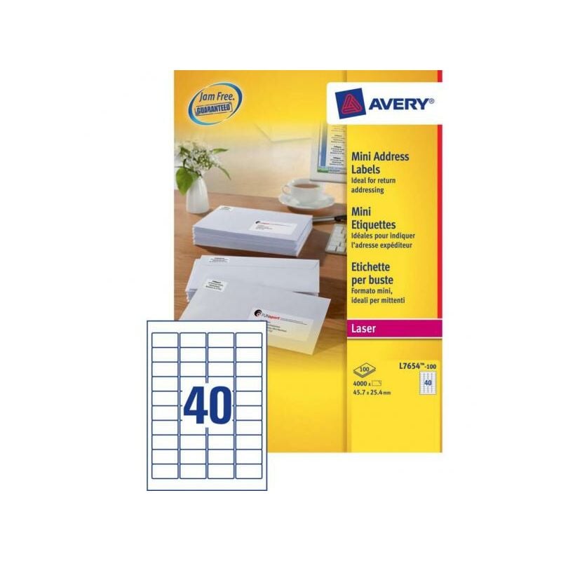 Larghezza dell'etichetta 4,57 cm Altezza dell'etichetta 2,54 cm Etichette da pacchi 4000 pz Fogli per pacco 100 fogli Colore del prodotto Bianco Tipo etichetta Etichetta per stampante autoadesiva Formato A4 Materiali Carta Tecnologia di stampa Laser/Inkjet Tipo di adesivo Permanente Forma Rettangolo Certificazione FSC CU-COC-809380, ECF