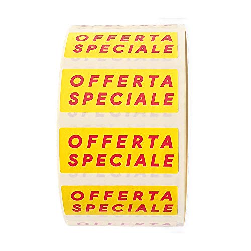 Rotoli da 2000 adesivi con scritta Offerta Speciale rossa, su fondo rettangolare giallo.