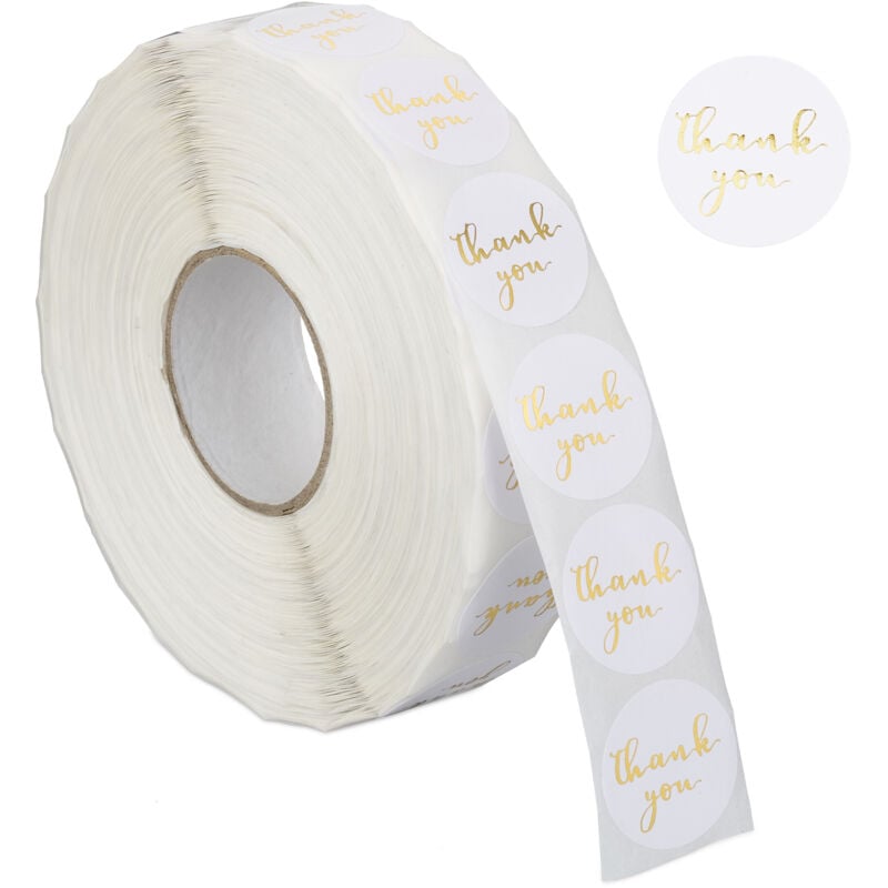 Con questo rotolo di etichette, potrai dare un tocco speciale a regali e simili e rendere felici amici, parenti o addirittura clienti. Con un totale di 2500 etichette in un pratico rotolo, avrai sempre a portata di mano un numero sufficiente di adesivi per sigillare buste, decorare scatole regalo o perseguire altre idee creative. Le targhette autoadesive presentano la scritta Thank You, che conferisce alle etichette un tocco di classe. Rotolo di adesivi in dettaglio - Dimensioni del rotolo H x D: 3 x 11 cm ca. - Peso del rotolo: 220 g ca. - Diametro degli adesivi: 25 mm ca. - Materiale: carta, plastica - In vari colori Etichette adesive con scritta Thank You - 2500 adesivi con un diametro di 25 mm - Elegante scritta Thank You - Per decorare i regali - aggiungono un tocco personale - Per sigillare in modo originale le buste e molto altro ancora - Il pratico rotolo di etichette è facile da riporre - Anche per scopi commerciali - un bel dettaglio per i clienti Contenuto della spedizione