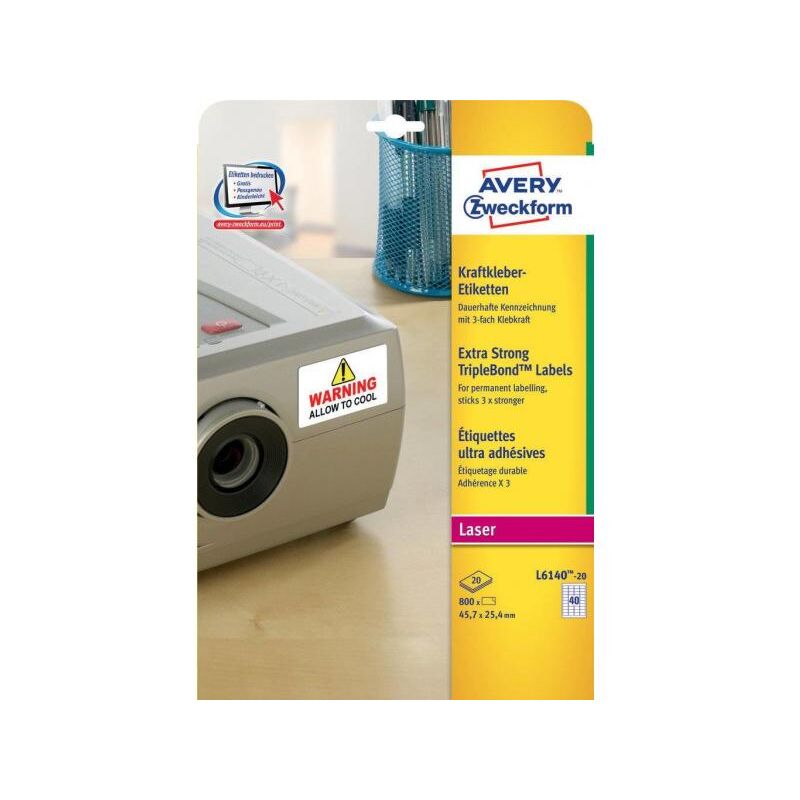 Vendi prodotti e hai bisogno di mostrare le informazioni sui prodotti? Cosa succederebbe se qualcuno maneggiasse o togliesse l'etichetta da un prodotto? Potrebbe causarti dei problemi legali o al livello di sicurezza, utilizza le etichette non rimovibili Avery - Garantite per durare 3 volte di più delle convenzionali etichette - Adatte per molte superfici, oltre che componenti elettronici, metallo, plastica, vetro - Ideali per applicazioni che dev durare nel tempo su prodotti o su attrezzature di proprietà su superfici convesse, molto calde, molto fredde, ruvide - Per essere sicuro che l'etichetta applicata duri nel tempo - Queste etichette non si strappano, resistono alle sostanze oleose, alla sporcizia e al grasso. Possono essere applicate su metallo, vetro, plastica, legno e a temperature estreme (da -20°C a +80°C). Larghezza dell'etichetta 4,57 cm Altezza dell'etichetta 2,54 cm Etichette da pacchi 800 pezzo(i) Fogli per pacco 20 fogli Etichette per foglio 40 pezzo(i) Colore del
