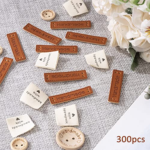 Etichette Cucito 300 Pezzi Bottoni in Legno, Etichetta in Pelle PU con Fori, Etichette in Tessuto Fatte a Mano con Amore per Fai da Te Vestiti Accessori Decorazioni Artigianali