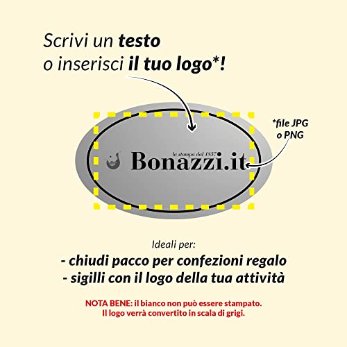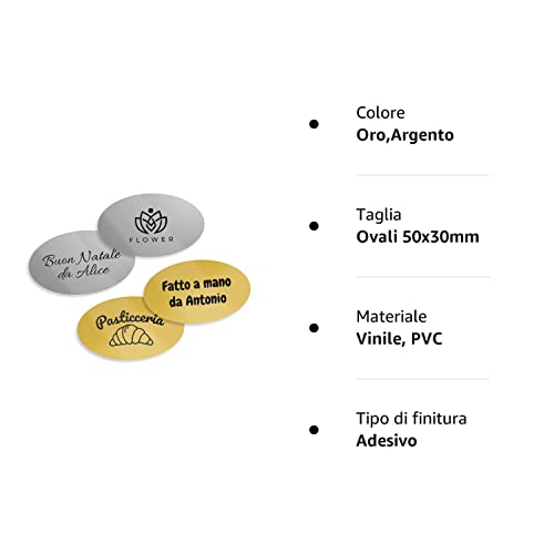 112 Etichette personalizzate ORO e ARGENTO per confezioni, bollini multiuso per CHIUSURA PACCHETTI regalo, adesivi sagomati chiudipacco, sigilli per confezionamento (Ovali 50x30mm)