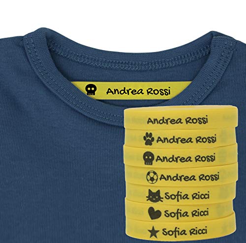 100 Etichette Personalizzate in ferro su tessuto per contrassegnare i vostri vestiti con varie Icone. Tela Gialla. Delicato sulla pelle dei vostri bambini. (Giallo)