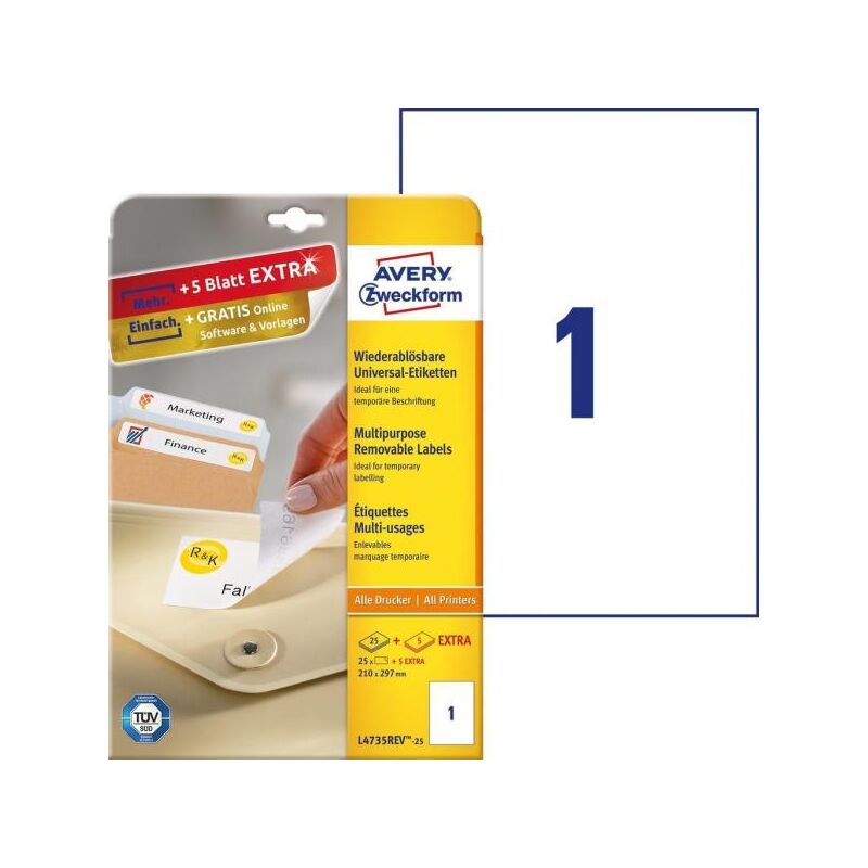 Larghezza del foglio 21 cm Lunghezza del foglio 29,7 cm Etichette da pacchi 30 pezzo(i) Etichette per foglio 30 pezzo(i) Colore del prodotto Bianco Forma Rettangolo Tipo di adesivo Rimovibile Colore etichetta Bianco su trasparente Formato DIN A4 Materiali Carta Tipo rifinitura Opaco Facile da applicare Sì Senza cloro Sì Certificazione TÜV