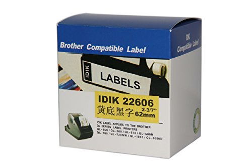 IDIK Etichette per stampanti Brother DK-2606 DK-22606, Resistente nastro di pellicola-Ampio-Stampa nera su giallo 62mm x 15,24m