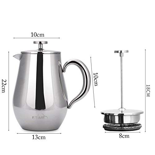 ETiME caffettiera francese a due strati realizzata in acciaio inox a due strati mantiene la temperatura del caffè o del tè per almeno 1 ora.