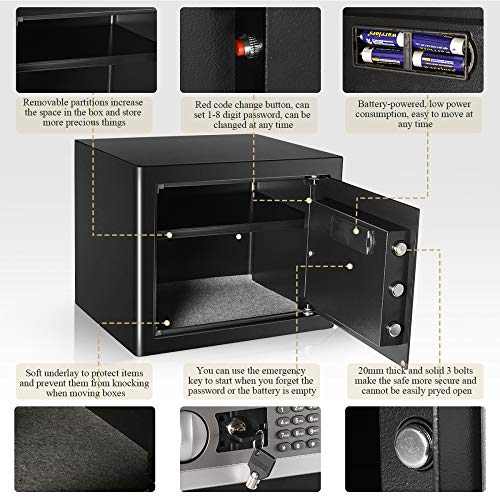 Dual Security Safe Protection3 20mm full steel live bulloni, tastiera digitale con codice programmabile da 3 a 8 cifre, due tasti di override manuale per emergenze, 30 secondi di riscaldamento bip saranno attivati una volta che tre volte password errata inserita e la tastiera digitale sarà bloccata in 2 minuti