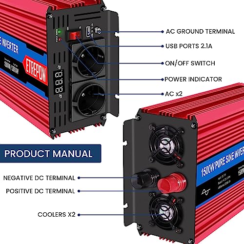 ETREPOW 1500w Power Inverter 12v 220v Onda Sinusoidale Pura Convertitore di Tensione Con Prese EU e 2 USB, Telecomando Senza Fili,Display Digitale e Ventilatori - picco 3000w Trasformatore.