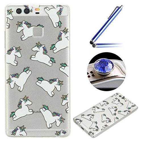 Etsue Custodia Huawei P9 Trasparente,Colorate Dipinto Modello Con Disegni,Huawei P9 Cover in Silicone Tpu Flessible Sottile Antiscivolo e Antigraffio Protettivo Cover Bumper Case Per Huawei P9+Blu Stylus Pen e scintillio di Bling Diamond Dust Plug colora casuale-Puledro