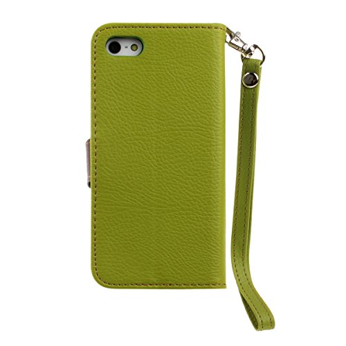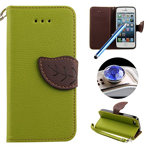 Etsue Custodia in pelle per iPhone 5 5S,la copertura della cassa del raccoglitore per iPhone 5 5S,creativo Foglia modello PU Custodia in pelle di caso di vibrazione con cinghia per iPhone 5 5S+Blu Stylus Pen e scintillio di Bling Diamond Dust Plug colora casuale-Verde
