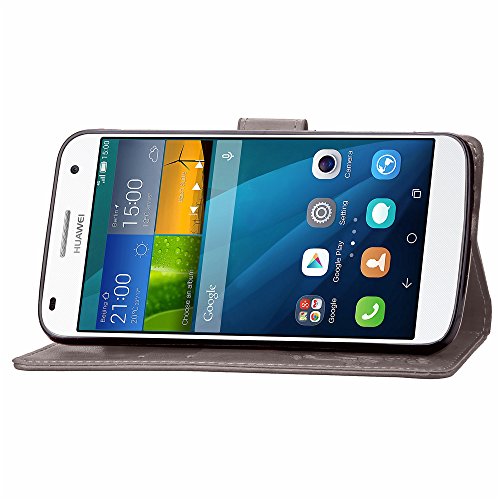 Etsue Huawei Ascend G7 Custodia,Wallet Flip Cover Per Huawei Ascend G7,Uomo Donna Retro Vintage Elegante Portafoglio Puro Pu Leather Bookstyle Copertura Con Magnetico chiusura[Lucky Clover Pattern]+Blu Pennino e scintillio di Bling Diamond Dust Plug colora Casuale-Grigio