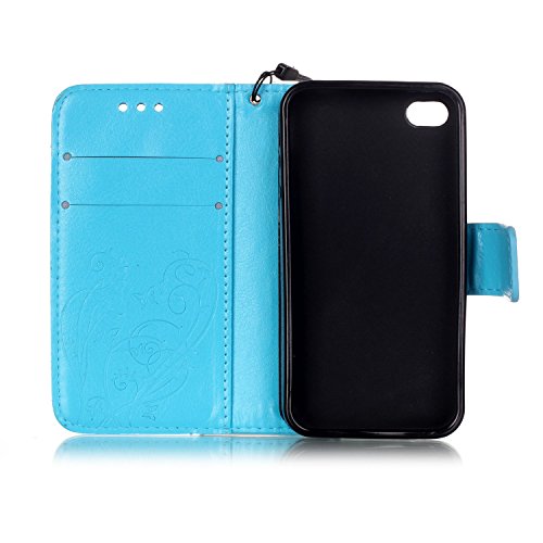Etsue iPhone 4 Cover Libro,iPhone 4S Custodia in Pelle,Blu Puro Leather Pu Portafoglio Flip Folio Wallet Bookstyle Con Magnetico Chiusura e Cinghia Motivo Floreale Fiori e Farfalle Creativo Disegni Colorato Amore Toppa Con Protezione Per Schermo Telefono+Blu Pennino e scintillio di Bling Diamond Dust Plug colora Casuale