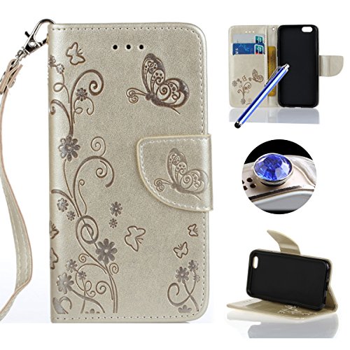 Etsue iPhone 6S Custodia,iPhone 6 Cover Portafoglio,iPhone 6S Cover in Pelle,Lusso Style ButterFly Modello Con Cinghia,Leather Pu Puro Flip Wallet Shockproof Protettiva Case Cover Con Magnetica Chiusura Per iPhone 6/6S 4.7+Blu Pennino e scintillio di Bling Diamond Dust Plug colora Casuale-Oro