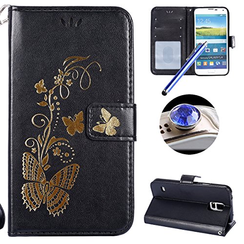 Etsue Samsung Galaxy S5 Cover,Samsung Galaxy S5 Custodia in Pelle,Elegante Bella Butterfly Oro Gold Artificiale Leather PU Puro Portafoglio Case Cover,Wallet/Libro/Flip Protettiva Case Cover Con Magnetica Chiusura/Card Slot/Supporto di Stand Per Samsung Galaxy S5+Blu Stylus Pen e scintillio di Bling Diamond Dust Plug colora casuale-&Black&