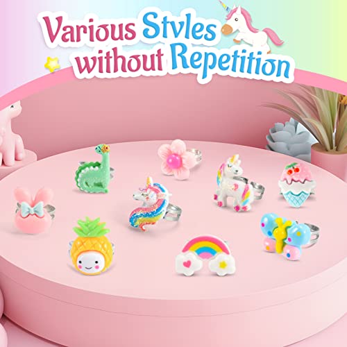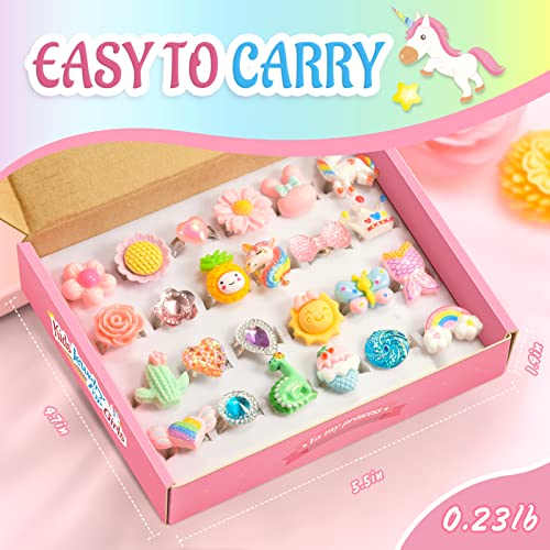 【Design unico】 24 diversi design di anelli con pietre preziose affascineranno la tua ragazza, tra cui corona, unicorno, arcobaleno, dinosauro, sirena, coniglio, gelato, ecc. Nessun design duplicato offre alla tua principessa più opzioni per l'abbigliamento e l'abbigliamento quotidiano.