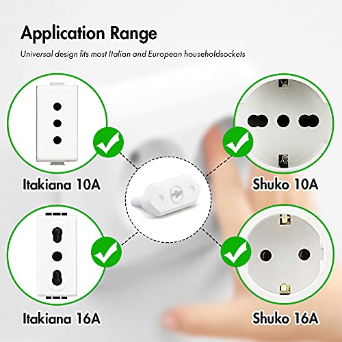 ★ Gamma application - design universale si adatta alla maggior parte delle famiglie italiane ed europee, o cioè prese 10A, prese 16A e prese schuko. La combinazione di 20 confezioni è di alto valore in uso e può soddisfare le tue esigenze per proteggere la maggior parte delle prese della tua casa.