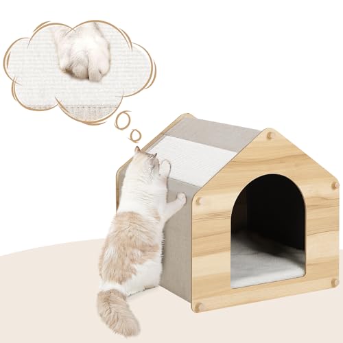EUGAD Cuccia per Gatti da Interno, Casetta in Legno per Gatti e Cani di Piccola Taglia, Casa per Animali Domestici con Lettino Lavabile e Tappetino Tiragraffi, 41x39x39cm, 0040GD