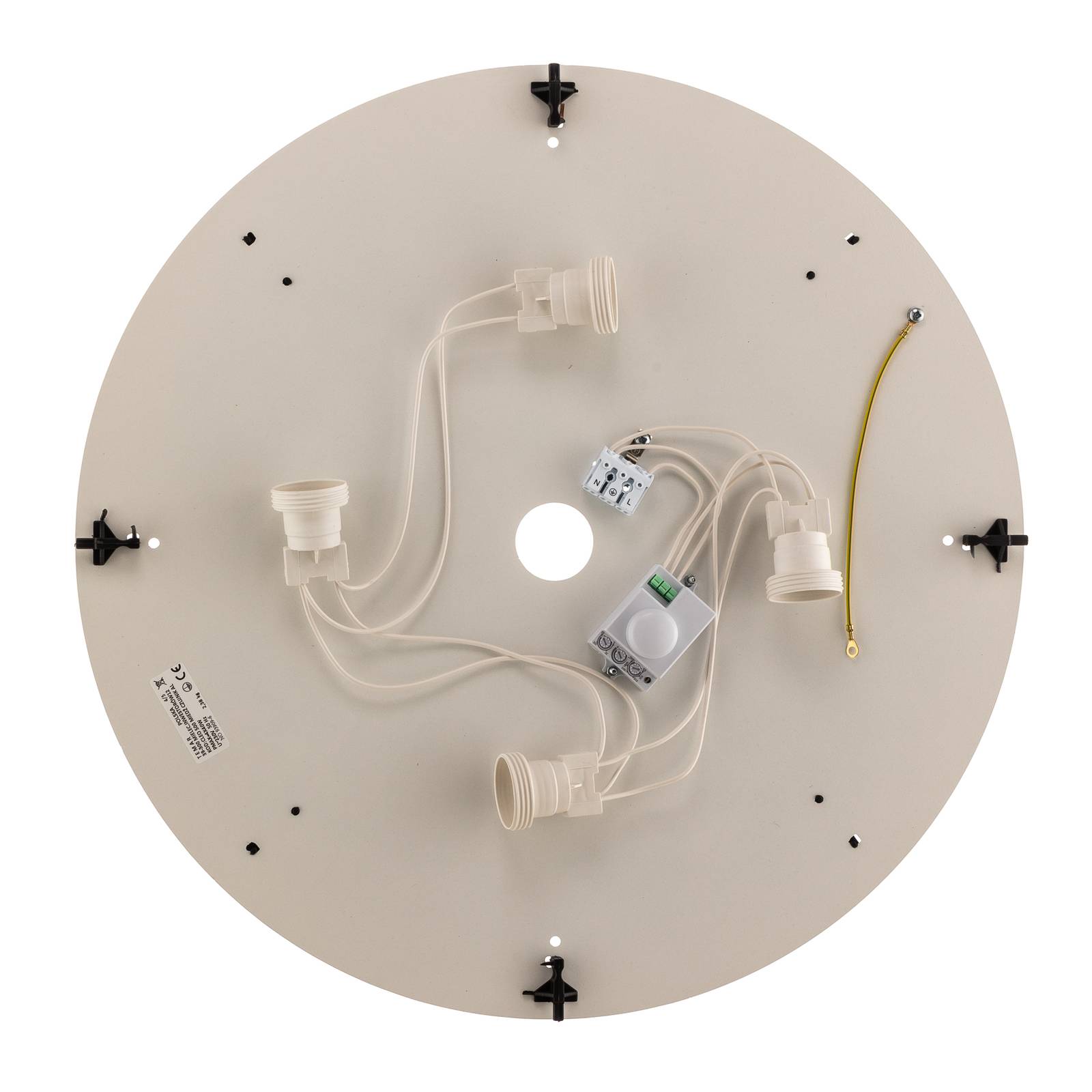 Plafoniera rotonda Cleo con prese E27, rilevatore di movimento incluso Dati tecnici rilevatore di movimento: - Gamma di rilevamento: 360 - Portata: max. 8 m - Regolazione del tempo: da 10 sec a 12 min - Intensità della luce: 3-2.000 lux - Altezza di installazione: 2-6 m