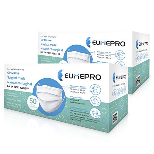 EUMEPRO Mascherine Chirurgiche Approvate CE, Made in Germany, 100 Pezzi, Certificato DIN EN 14683 Tipo IIR, Efficacia di Filtrazione Batterica >99,9%, Mascherina Protezione Nasale Usa e Getta, Bianco